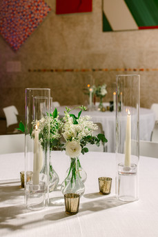 Cocktail Tables: Each was adorned with a single bud vase featuring white blooms and fresh greenery, accented with gold votives for a subtle touch of glamour. Fresh Greenery was tied around the linens for a more elevated look.